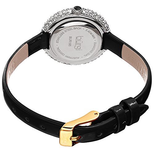 Crafted from the finest materials and inspired by the modern fashion industry, this Burgi timepiece displays an incredible presence of prestige and luxury. The entire case is studded with Swarovski crystals in seamless clusters, leaving a sliver of rose gold tone bezel to affix the protective crystal lens. The delicately crafted black dial is adorned with hand-applied markers, including a single genuine diamond at the 12 o'clock position. Inside, a highly advanced quartz movement ensures top notch accuracy and reliability in its classic three-hand timekeeping. Color-coordinated to match, this watch is accented with a black enamel cabochon on the ground and outfitted with a glossy black genuine leather strap.Feature