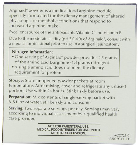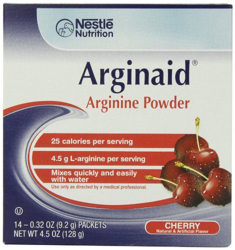 ReleaseDate : 2009-03-17 Studio : Arginaid Publisher : Arginaid Binding : Health and Beauty Product Description RESOURCE ARGINAID Drink Mix is an arginine-intensive powder formulated for patients recovering from burns, surgery, or chronic wounds. Each serving contains 4.5 g of L-arginine along with supplemental vitamins C and E. RESOURCE ARGINAID mixes easily with water and is available in three delicious fruit flavors: Lemon, Orange, and Cherry. 0