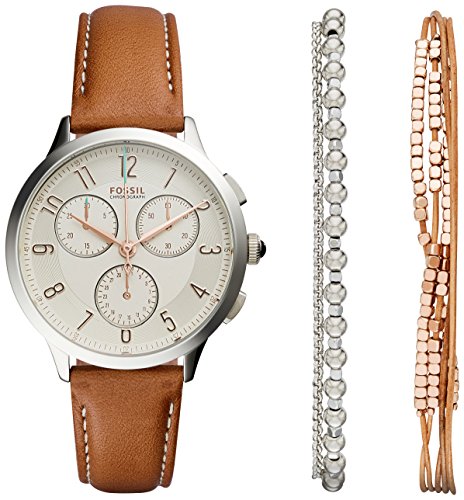 -. Feature : FOSSIL Damen Uhr Set (Uhr und Schmuck) - rundes Edelstahlgehäuse (Durchmesser 34 mm), glänzend und gebürstet - wasserdicht bis 3 ATM / Braunes Lederarmband - Dornschließe / Silbernes Zifferblatt mit Muster und silbernen arabischen Ziffern - Chronograph mit Datum - roségoldene Zeiger - Mineralglas / 2 Armbänder inbegriffen: 1 braunes mehrreihiges Lederarmband mit roségoldenen Edelstahlkugeln (Zugverschluss) + 1 Edelstahl Kettenarmband mit silbernen Kugeln (Karabinerverschluss) / Verpackt in FOSSIL Geschenk Box