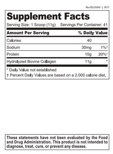 Safety Information: Hydrolyzed Collagen Peptides should be stored in tightly sealed, airtight container in normal indoor conditions. Do not freeze, refrigerate or expose to moisture. Under proper conditions, collagen will remain stable indefinitely. Indications: Supporting Skin Health and Connective Tissue Support Ingredients: Bovine Hide Collagen Hydrolysate