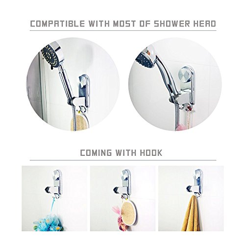 Shower Head Holder Rotatable Adjustable Wall Mount Strong Suction Cup Shower Head Bracket with Hook - Shower Arms Faucet Cradle Installation Kits Bathroom Accessories - No Drilling Required (Silver)