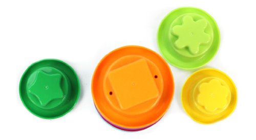 SHAPES, SIZES, AND COLORS: Each cup features a different embossed shape along the edges, as well as a different shape pressed into the bottom of the cup. They come in assorted colors and sizes as well so that your baby can stack and nest them into one another.