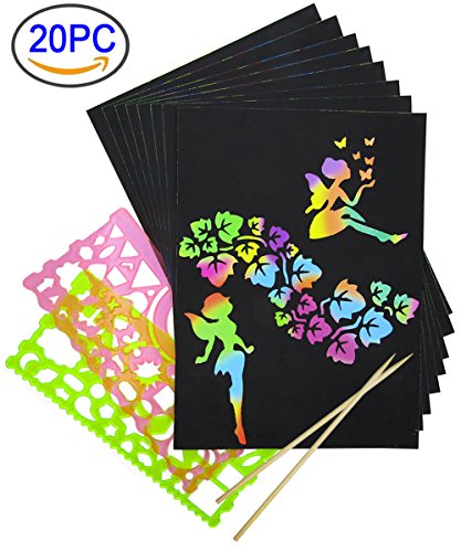 ✔ In each package 20 scratch off paper boards, each measuring 10.25 x 7.5 Inch with 2 Pieces Wooden Stylus and 2 Pieces Drawing Stencils