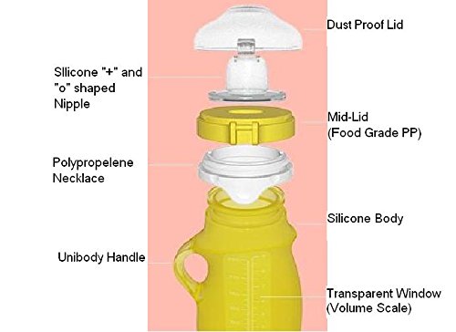 -. Feature : -Non-toxic BPA-free food grade silicone. - Great to eat yogurt, juices, purees, porridges, liquidy baby cereals, and other liquid foods - Comes with "o" shaped and "+" shaped nipple for different ages - Resists temperatures from -76F to 500F - 8.5oz. - Features unibody handle - Durable, collapsible and foldable - Try it for babies from 6 months up to a school age - Great for outdoors -100% Guarantee
