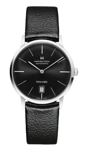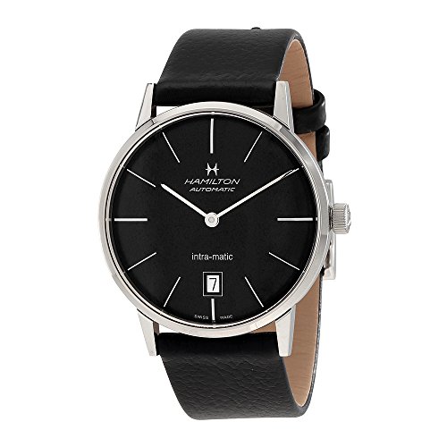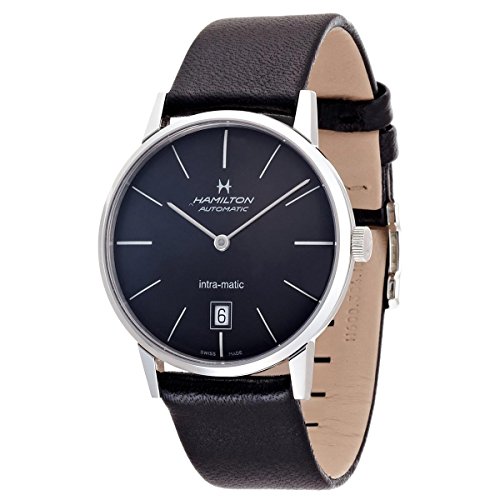 Studio : Hamilton Publisher : Hamilton Binding : Watch Product Description Stainless steel case with a genuine leather strap. Fixed stainless steel bezel. Black dial with silver-tone hands and index hour markers. Dial Type: Analog. Date display above the 6 o'clock position. Automatic movement. Scratch resistant sapphire crystal. Skeleton case back. Case diameter: 38 mm. Round case shape. Tang clasp. Water resistant at 50 meters / 165 feet. Functions: date, hour, minute. Casual watch style. Watch label: Swiss Made. Hamilton Intra-Matic Black Dial Leather Mens Watch H38455731. 0