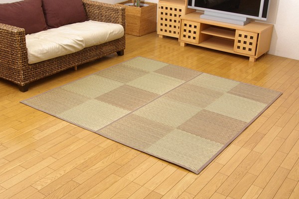 濃淡をはっきりとさせた市松柄のイ草カーペットです。い草には空気の自然浄化作用、湿度の調節作用などがあります。また汚れにくく、使用するうちに黄金色に変化し味が出ます。い草に青森ヒバ加工を施しています。(抗菌、防臭効果)フローリングを傷つけにくいよう裏には不織布を貼っています。