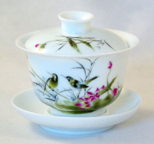 -. Brand : Bana Tea -. Color : Green and pink -. EAN : 0705105176338 -. Feature : This gaiwan is made of fine porcelain and depicts two birds perched above a red-tipped blossom and leaves. / Bana Tea products ship from the United States / Tea connoisseurs often brew the tea right in the gaiwan although it may also be used conventionally as a tea cup, the lid serving the dual function of keeping the tea warm and to block the tea leaves from consumption. / Includes samples of premium Bana Pu-erh tea. / The gaiwan is 3.5" wide x 3.25" tall and holds up to 4 ounces of tea to lid level. -. ProductGroup : Kitchen -. ProductTypeName : KITCHEN -. Title : Bana Two Birds and a Blossom Chinese Gaiwan (Traditional Chinese Teaware Comprised of a Cup, Saucer and Lid) and Pu-erh Tea Sample -. UPC : 705105176338