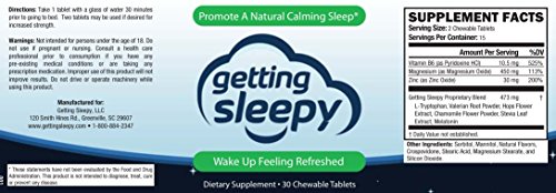 - Feature : THE BEST SLEEP YOU'VE EVER HAD: Guaranteed to help you get to sleep faster, and stay asleep longer. Our fast acting design and blend help you wake up feeling refreshed! / FAST-ACTING CHEWABLE: No large pills to swallow. Pills can take over an hour to dissolve in your stomach, but when you're tired, you want to get to sleep FAST. Getting Sleepy's unique chewable takes effect in less than 15 minutes. / EIGHT ALL-NATURAL INGREDIENTS: Including Melatonin, Valerian, L-Tryptophan, ZMA, Hops Flower, Chamomile / SAFE, NON-HABIT FORMING: Drug-Free, and Manufactured in the USA at an FDA-Approved Facility in Greenville, South Carolina.