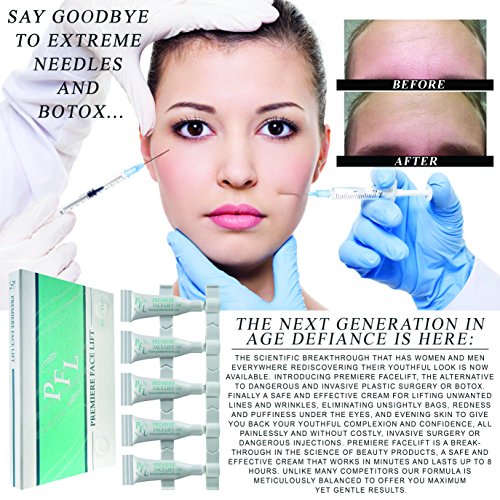 THE NEXT GENERATION IN AGE DEFIANCE IS HERE: The scientific breakthrough that has women and men everywhere rediscovering their youthful look is now available. Introducing Premiere Facelift, the alternative to dangerous and invasive plastic surgery or botox. Finally a safe and effective cream for lifting unwanted lines and wrinkles, eliminating unsightly bags, redness and puffiness under the eyes, and evening skin to give you back your youthful complexion and confidence, all painlessly and without costly, invasive surgery or dangerous injections. Premiere Facelift is a breakthrough in the science of beauty products, a safe and effective cream that works in minutes and lasts up to 8 hours. Unlike many competitors our formula is meticulously balanced to offer you maximum yet gentle results. Simply apply Premiere Facelift under tired, heavy, or baggy eyes and to areas of the face that contain unsightly wrinkles or sagging. Within minutes Argireline--the active ingredient in Premiere Facelift--begins to relax facial muscles to seamlessly even wrinkles, reduce redness, shrink pores and produce results you never thought possible. If it all sounds to good to be true, we understand. Sensational claims are common, never more so than in the area of health and beauty. However, Premiere Facelift has proven through multiple scientific studies both its safety and effectiveness. Premiere facelift stands by our products with a 100% customer satisfaction guarantee, if at anytime you are unhappy with your purchase, return it to us for a full and prompt refund.