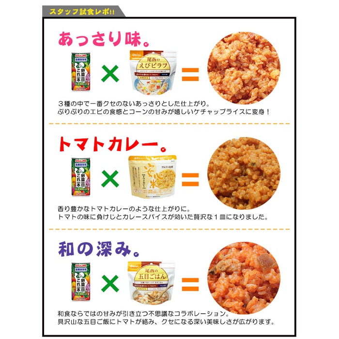 비주식 이것 이《지》라이스6 식세트 비주식으로서 완전히 잘 아는 알파 미이지만,알파 미를 만드는 때문에는 물이 필요합니다.재해시에 『수의 비축이 족하지 않고 밥으로 할 수 없다』 이라고 하는 사태가 일어날지도 모릅니다.그런 때에는,수 대신에 쥬스 등을 사용해도 밥을 만들 수 있는 것을 존이성입니까?비상시의 식사는 아무리 해도 야채 부족이 되기 쉬워 #이,알파 미를 만들 때에「야채 쥬스」를 이용해 밥을 만들면,부족하게 쉽상인 야채의 섭취도 가능해 추천입니다. 「네?쌀과 야채 쥬스?!」와 기죽는 분(쪽,편)도 계실 것입니다만,알파 미와 야채 쥬스에 만든 밥은,훌륭한 빨간 색과 좀 좋은 신맛에 마치 치킨라이스의 같습니다.백반이라면 신맛이 강하게 느낄 수 있어 야채 쥬스의 맛이 이겨 느끼는 때문에,야채 쥬스가 서투른 분으로는 악평이었습니다만,드라이 카레나 모듬밥,새우 pilaf 등구의 들어간 알파 미에 시험해 보면,비주식이라고 하는 줄 모를 만큼의 맛있음입니다.특히 코라보(콜라보레이션)으로 추천의「새우 pilaf」「모듬밥」「드라이 카레」와「야채1일(날) 이것 1개」합계6 식분을 세트로 했습니다!전용상자로 세트 해 전달합니다 때문에,비축용답례용으로 추천♪재해시에 알파 미에 싫증나 버린 시나,평상시의 식사로도 부디 시험해 주셔 대 조리법입니다.※메이커 보다 입하 하는 최신의 상품에 제작 하고 있습니다만,중에는 유통 과정으로 제조부터 수인지(든가) 월경 스쳐 하고 있는 상품도 포함되어 있습니다. 미리 승낙 후 입수해 주세요.세트 내용 비사이 식품의 알파 미 새우 pilaf ×2 포안심 미(알파 미) 드라이 카레 ×2 포비사이 식품의 알파 미 모듬밥 ×2 포야채1일(날) 이것 1개 ×6 관세트 상자의 크기 약 300×240×80mm
