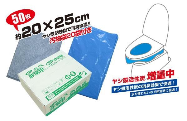 水を使えない状況でもシートを使用するだけで用を足せます。溶けるシートを採用!!使用後は固まるので簡単にゴミとして廃棄可能です。小便シート1枚で1~2回、大便はシート上下で各1枚(大便をシートではさみこむように)ご使用すると有効です。小型のペットにも使えて便利です♪ 製造国:日本 素材・材質:吸水シート:吸水ポリマー・ヤシ殻活性炭汚物袋:ポリエチレン 商品サイズ:吸水シート:1枚(約)200×250mm 重量:吸水シート:1枚(約)9g 仕様:約400mlの水分を吸収汚物袋45Lタイプ未使用・未開封で10年間保存可能 セット内容:吸水シート×50枚、汚物袋×20袋、説明書×1枚 ※サプライヤー直送品 ご注文後5~6営業日後の出荷となります【商品名】ヤシレット ヤシ殻活性炭 ラビン非常用トイレ シートタイプ50回(汚物袋付) BR-911
