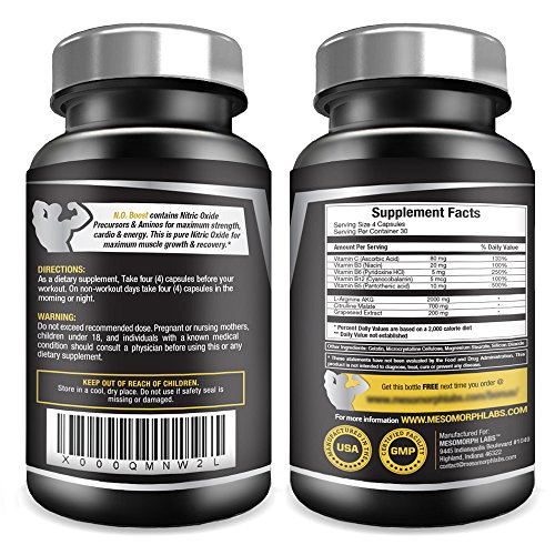 -. Feature : #1 N.O. BOOST NITRIC OXIDE BOOSTER - N.O. Boost by USA-Made Mesomorph Labs fully maximizes nitric oxide production with the addition of Aminos & Nitric Oxide Precursors. Nitric oxide "N.O." benefits muscle growth, recovery, adrenaline & the development of lean muscle mass. Many athletes take N.O. as a way to workout harder & longer. Reach new Nitric Oxide levels with precursors available only in N.O. Boost - Try it today Risk-Free! If you aren't satisfied you'll receive 100% of your money back! / LEAN MUSCLE MASS - Try N.O. Boost today to achieve more effective lean muscle mass! Along with a great diet & exercise regimen, N.O. Boost contains top ingredients in N.O. today, including L-Arginine & L-Citrulline Malate. Great for the heart, non-stimulatory, and great for enhancing blood flow & recovery. One-of-a-kind formula! Well researched non-essential amino acids like L-Arginine are great for supporting nitric oxide production! / CARDIO, BLOOD FLOW, VEINS - Most of us take nitric oxide for muscle growth. Blood flow is also a major benefit for taking N.O. Boost. Better cardio, heart health & blood flow in all parts of the body! With N.O. Boost more vascular dilation & vein definition is a real benefit that customers enjoy. Look great & feel great with Mesomorph N.O. Boost - Premium USA-Made Nitric Oxide Booster. / TRY IT TODAY! - Great for powerlifters, bodybuilders, gym rats, athletes, women & men. No banned substances, all-natural ingredients, and cutting edge N.O. formula in the nitric oxide world. You'll feel it more than any other nitric oxide booster, feel more workout strength right away! Try it today risk-free & backed by our money back guarantee! / WHY MESOMORPH LABS - Customers are #1 to us, by ordering with us you will be eligible for unbelievable promotions you'll find no where else - check your bottle for details! Many companies sell products, few companies sell programs! With satisfied customers from all over the world, you can be assured Mesomorph Labs will deliver for you. Our industry competitive high potency formulas are backed with a 100% money-back guarantee.