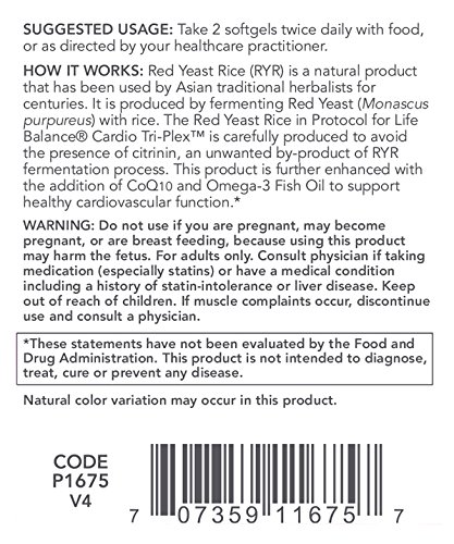 HOW IT WORKS: Red Yeast Rice (RYR) is a natural product that has been used by Asian traditional herbalists for centuries.  It is produced by fermenting Red Yeast (Monascus purpureus) with rice.  The Red Yeast Rice in Protocol for Life Balance® Cardio Tri-Plex is carefully produced to avoid the presence of citrinin, an unwanted by-product of RYR fermentation process.  This product is further enhanced with the addition of CoQ10 and Omega-3 rich Fish Oil to support healthy cardiovascular function.*