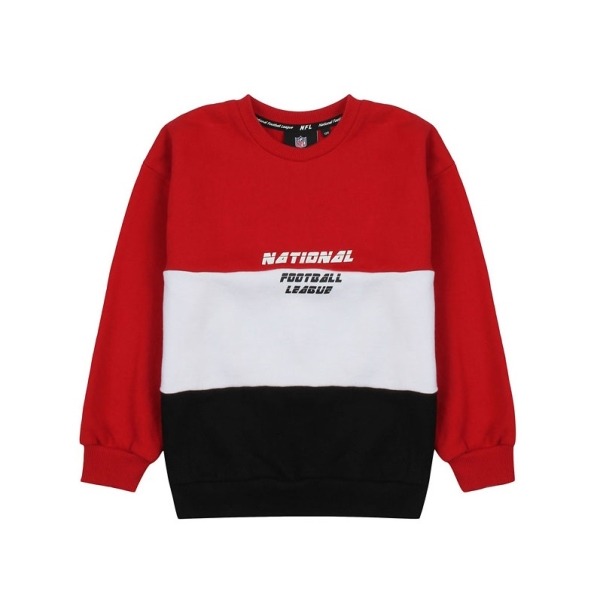 3단 컬러블록 드롭 소매 맨투맨 티셔츠로 앞 절개 위 레터링 나염과 뒷 NFL 엠블럼 나염이 포인트인 아이템입니다.