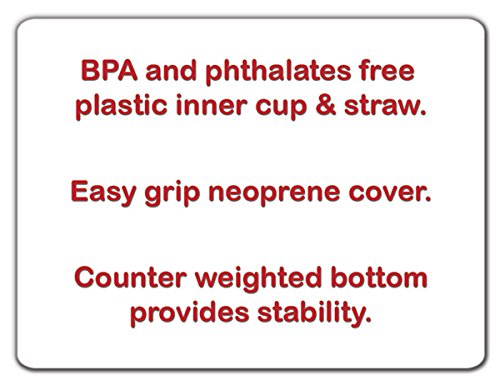 Cushioned cover affords a secure grip and eliminates condensation and sweating. Fits in most car cup holders and the counter-weighted bottom provides stability. Bottom diameter is 2 ¾ inches.