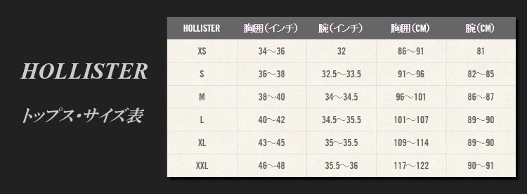BUMPSをご覧いただきありがとうございます。当店はロサンゼルスから本物のアイテムだけを扱っておりますのでご安心してお買い物をお楽しみ下さい。商品はロサンゼルスからの発送となりますのでお時間に余裕をもってご注文下さいますようお願い致します。■ホリスターホリスターはアバクロが2000年に発表したサーフテイストなセカンドライン。柔らかな着心地と西海岸のサーフスタイルを意識したデザインが魅力。デザインやユースド加工といったアバクロの特徴であるホリスターウォッシュという特殊な加工が施され新品ながらも長年をかけて着古された感のあるアイテムは多くのファンを魅了しています。【サイズ・寸法】当店はホリスター公式発表のサイズを表示しております。サイズ表(胸囲:腕)XS:86~91cm:81cmS:91~96cm:82~85cmM:98~101cm:86~87cmL:101~107cm:89~90cmXL:109~114cm:89~90cmXXL:117~122cm:90~91cmホリスター/アバクロ メンズ Tシャツ 半袖&長袖