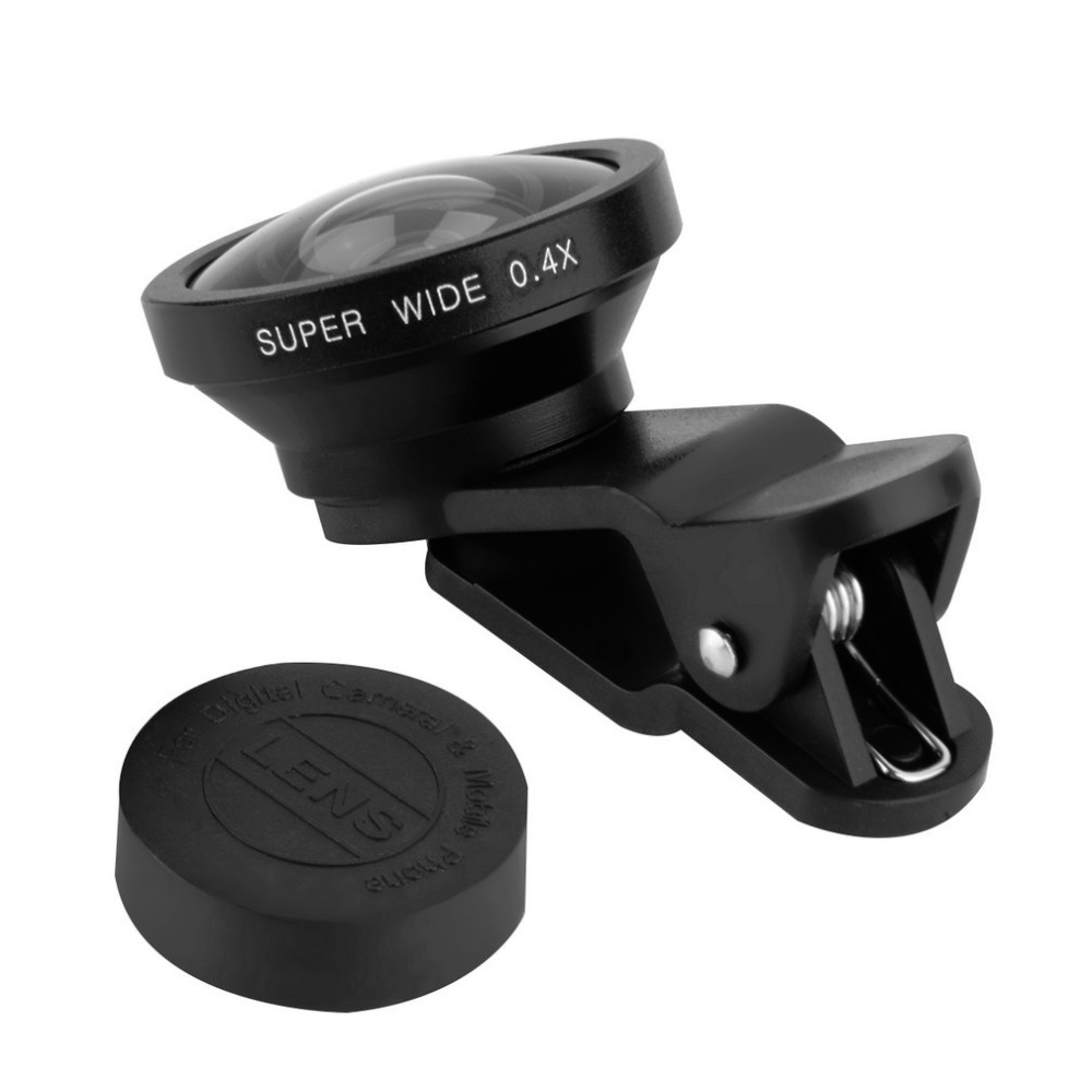 0.4X wide angle magnification camera lens with a circular clamp, universal for most mobile phones.
