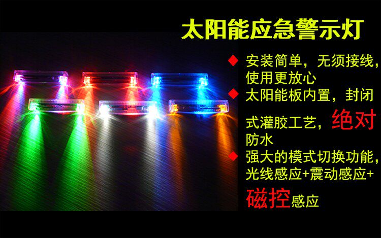 Car multi-functional emergency warning lights is a new automotive products, the product-free wiring, maintenance-free, the product inside the solar charging module and lithium battery storage devices, warning function automatically open the lights while driving at night to have a good road safety supporting role.