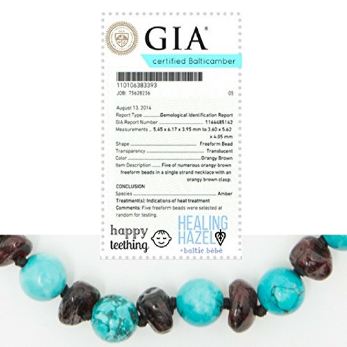 -. Feature : NATURALLY SOOTHING | Amber has long been known for its pain relieving properties when in contact with the skin. These carefully polished stones will bring comfort to your baby when teething starts, and help restore peace back to your home! / HANDCRAFTED BALTIC AMBER | Made in Lithuania from certificated local amber, this necklace is beautiful turquoise with gemstones. Here at Healing Hazel, quality is a P.R.Iority - this is why we hold an authenticity certificate issued by the recognized GIA (Gemology Institute of America) / SAFETY TESTED FOR YOUR PEACE OF MIND | This product has a safety release, is tested by a third party lab, and meets all necessary safety standards. It is 100% lead-free. The clasp and thread are tested up to 15 pounds of pressure. / EASY TO USE | The easy-to- use pop clasp is 11 inches long and the amber beads are polished for a gentle smoothness on your baby's skin. / IDEAL FOR TEETHING | We all know that teething is a stressful time for you and your baby. Wearing this necklace will help by relieving your child's pain and also reduce inflammation, so you can both enjoy happy days again.