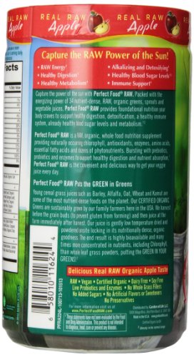-. Binding : Health and Beauty -. Brand : Garden of Life -. Department : Health and Personal Care -. EAN : 0644222308751 -. Feature : New Look. Same Formula. / Perfect Food RAW is the convenient and sensible way to get your veggie juice every day with 34 nutrient-dense, RAW, organically grown greens, sprouts and vegetable juices. / RAW, Vegan, Dairy Free, No Fillers, Added Sugars or Herbs, No Synthetic Chemicals / RAW, whole food nutrition providing naturally occurring antioxidants, enzymes, amino acids, essential fatty acids, and dozens of phytonutrients. / Bursting with prebiotics, probiotics, and enzymes to support healthy digestion and nutrient absorption. -. IsAdultProduct : 0 -. IsAutographed : 0 -. IsMemorabilia : 0 -. Label : Garden of Life -. LegalDisclaimer : Actual product packaging and materials may contain more and different information than what is shown on our website. We recommend that you do not rely solely on the information presented and that you always read labels, warnings, and directions before using or consuming a product. Please see our full disclaimer below. -. Manufacturer : Garden of Life -. MPN : G11624 -. NumberOfItems : 1 -. PackageQuantity : 1 -. PartNumber : G11624 -. ProductGroup : Health and Beauty -. ProductTypeName : HEALTH_PERSONAL_CARE -. PublicationDate : 2013-09-22 -. Publisher : Garden of Life -. ReleaseDate : 2013-09-19 -. Size : 224 g -. Studio : Garden of Life -. Title : Garden of Life Raw Org. Perfect Food Apple 224g Powder (Packaging May Vary) -. UPC : 644222308751