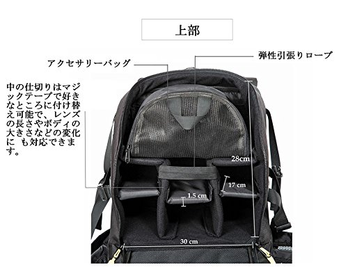 -. Feature : ★【規格】材質:1680D高密度防水ナイロン 重量:2.8kg サイズ:58*24*33cm / ★【大容量収納バッグ】メインポケットは大容量で、洋服、日用品、本を入れることができます。17インチまでのノートパソコン・iPad の専用収納スペースがあり。あなたの持ち物を格納するための十分なスペースを提供します。 それはハイキングのための非常に良いバックパックであり、長い旅行、大学、学校、そして毎日使用しています。 / ★【持ち運びに最適】三脚を取り付けて運ぶために調整可能なストラップ(バッグの上とバックの左右に)とホルダー(底部に)を装備です。身長に合わせて長さ調節可能なショルダーストラップとウエストベルトを装備です。 / ★【軽減負担・通気設計】背面にもショルダーベルトと同様のメッシュ生地を採用、曲線の溝を入れることで通気性を良くし、長時間使用時のムレを軽減してくれます。 / ★【雨天にも心配なし】耐水性と涙耐性のファブリック、専用レインカバーも付属する(バックパックの上部に専用ジッパー付きポケットに収納)ので雨天時の使用も可能です。