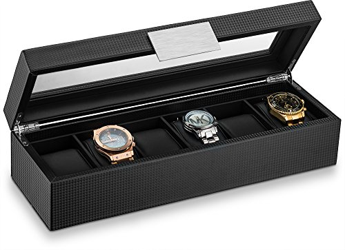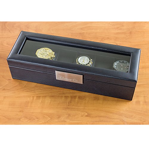Glenor Co Watch Box for Men - 6 Slot Luxury Carbon Fiber Design Mens Display Case, Large Holder,Metal Buckle -Black