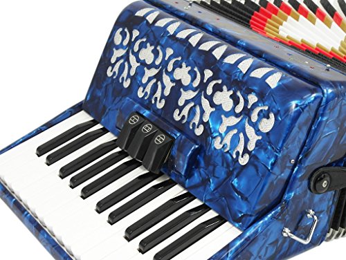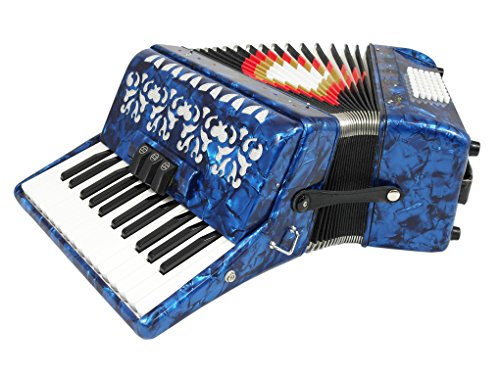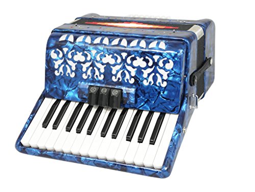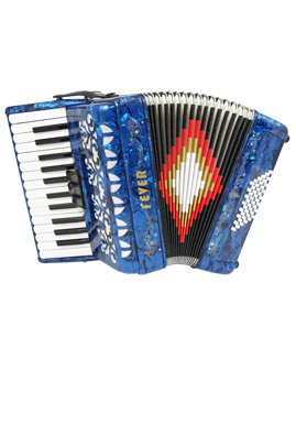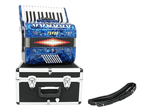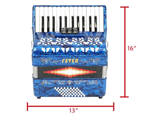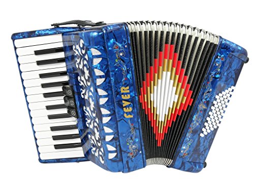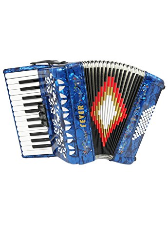 Studio : Fever Publisher : Fever Binding : Electronics Product Description This Beautiful Fever Piano Accordion 3 Switches 26 Piano Treble Keys 48 Bass button accordion has everything you may need and more. Features 26 full chromatic piano melody keys enough to play all the songs you want, 48 Bass/Chords buttons for harmony and accompaniment, 3 switches that provide warm, and even tone. Features Italian Style decorations and pearlescent colors. There are single straps hooks on each side of the accordion with plenty of room for the two extra PU leather padded shoulder straps included. The bellows are 18 fold in size for bigger sound and have sheepskin corners for longer life. The acoustically designed grill cloth provides a bigger sound than most other comparable accordions. A slide lever air valve makes for faster air intake. The accordion comes with a premium case with lock, and a set of keys. Accordion Dimensions: 13 inches in Length, 16 inches Height and 7 inches width. Accordion weight 13 lbs approximately. 0