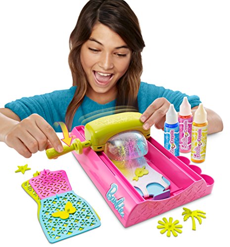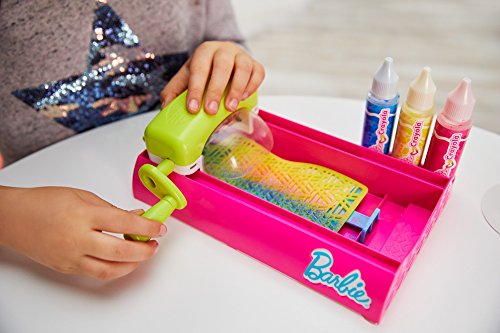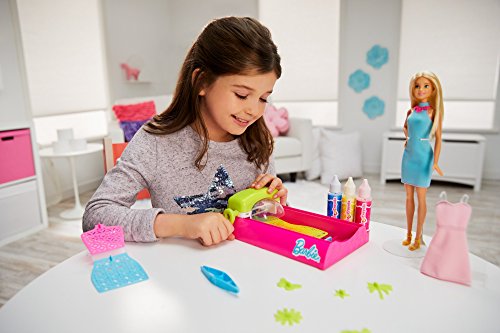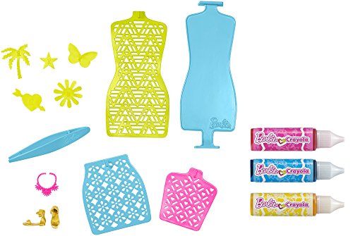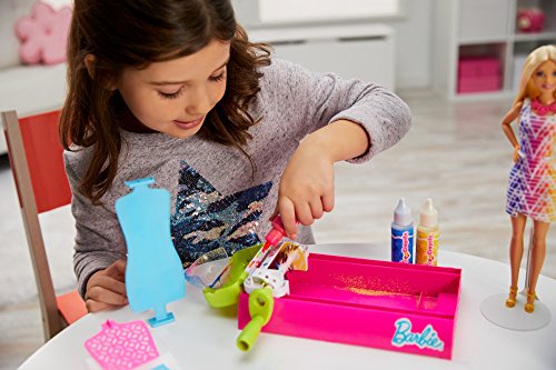Create unique, colorful fashions for Barbie doll with the Barbie Crayola Color Magic Station doll and playsets. Designing is easy! Choose one of the three included fashions -- each trendy dress is washable to allow for endless fashion designing fun. Place the fashion on the dress form and place the dress form in the Color Magic Station. Then choose your stencils, and place them on the fashion. Each set comes with one full-length stencil, two half-length stencils and five smaller icons, like a butterfly, heart and palm tree. Next, pick a Crayola paint color (pink, yellow and blue are included), add it to the paint compartment and close the lid. Turn the handle while pushing it forward to create a colorful paint-splash effect. Use one or more stencils. Try one or more colors. You decide because you’re the designer! When done designing, remove the stencils with the tweezers and reveal your finished look. It’s so cool! Dress Barbie doll in the finished fashion and accessorize with the included shoes and necklace. Wash the looks out to create a fresh canvas and design again and again! Young designers will love seeing their artistic ideas become wearable fashions for Barbie doll! Includes Barbie doll wearing washable fashion and accessories, two additional washable fashions, the Color Magic Station, one full-length stencil, two half-length stencils, five smaller stencils, three Crayola paint colors and tweezers. Each sold separately, subject to availability. Dolls cannot stand alone. Colors and decorations may vary.Feature