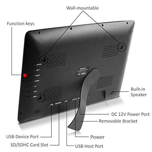 -. Feature : 14-Inch High Definition (1366x768) LCD Screen / Multi-media player to display photos and play audio and video files / 2GB built in memory to store files; SD/SDHC card slot and USB port to read various external devices / Built-in speakers; integrated stand and wall mountable; calendar and clock functions