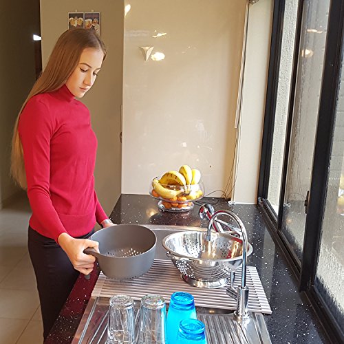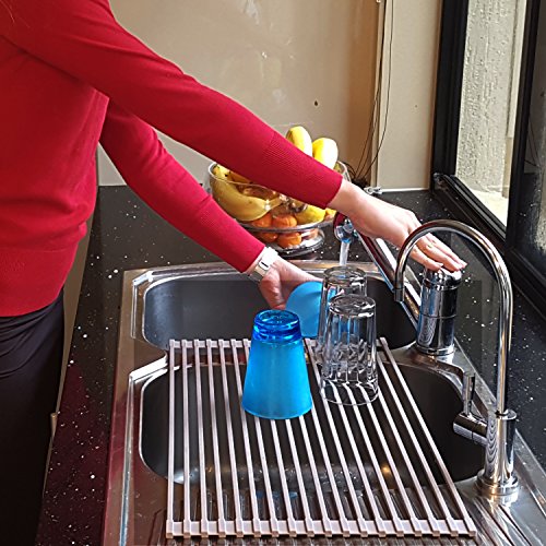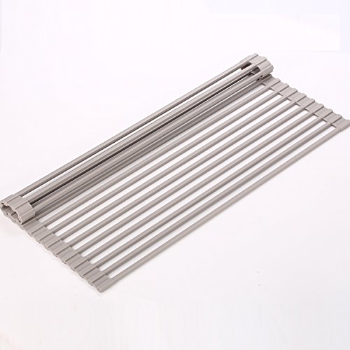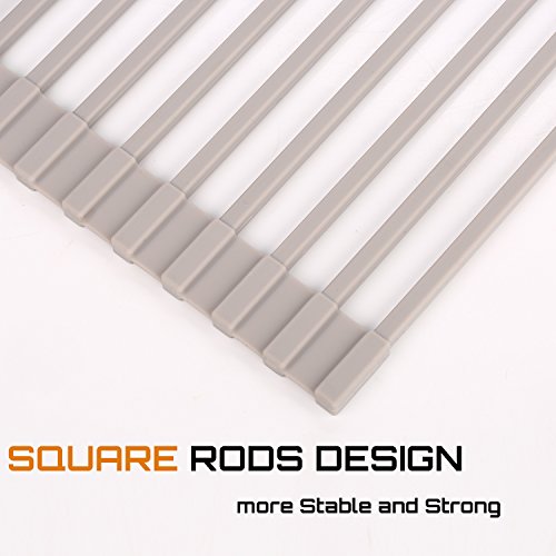 Over The Sink Drying Rack - Roll Up Dish Drying Rack (Square Rod Design) Large Size 20.5" x 12.75" Stainless Steel with Anti Slip Silicone Cover (Warm Grey)