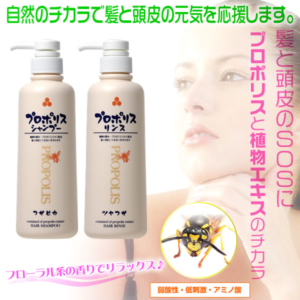プロポリスに、冬虫夏草・オタネニンジン・センブリ・ヒキオコシなどの植物エキスで潤いのあるしっとりとした髪に仕上げます。 弱酸性・低刺激・アミノ酸系のシャンプー&リンスです。