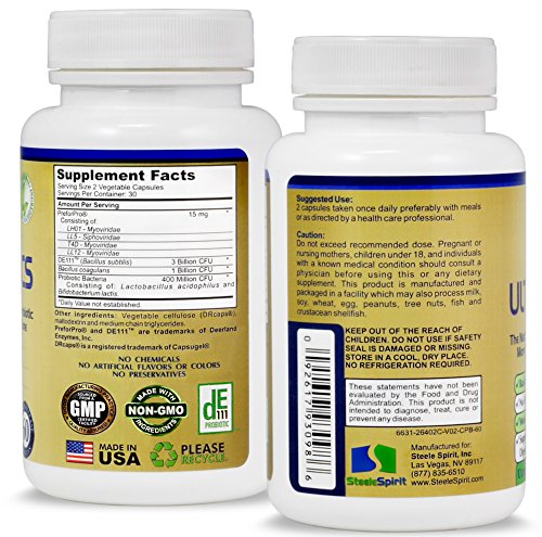 -. Feature : GET WELL STAY WELL - Steele Spirit Ultra-Biotics, The Next Generation best probiotics and prebiotics for women, men and kids, is spore enhanced for added health benefits and Scientifically arguably the best probiotic supplement and immune system support booster, that works against and crowds out bad bacteria which make you sick, allowing the growth of only good, healthy bacteria that makes you feel great. / WORKS IN HOURS NOT DAYS - Only our unique prebiotic PreForPro feeds and nourishes good bacteria and enhances their health benefits, while our spore forming probiotics DE111 Bacillus subtilis and Bacillus coagulans, crowd out bad, unhealthy bacteria, supporting and strengthening your digestive and immune system within hours, to improve your health and help you safeguard against illness and infections. / EASY TO TAKE AND NO REFRIGERATION - Ultra-Biotics is a once daily dosage, is easy to swallow and can be taken with food; we do not require refrigeration; you can travel and take a dose anytime, anywhere which makes your life simple. / HEAT AND ACID RESISTANT - Our amazing formulation uses patented delayed-released, DRCaps which are acid resistant and delivers our probiotics and prebiotic alive and intact deep inside your upper and lower intestines exactly where they are needed to optimize your health; most other probiotic nutritional supplements don't. / QUALITY ASSURED, RISK FREE - Our probiotics and prebiotic supplement for women, men and children, is made in the USA in an NSF Certified/GMP and FDA Registered facility, are Non GMO and 3rd party tested; join thousands of satisfied customers and order yours today to improve and protect your health; We are so confident that you will love it, that we'll refund every penny if you don't like it. Simply contact Steele Spirit directly for a full refund. What do you have to lose?