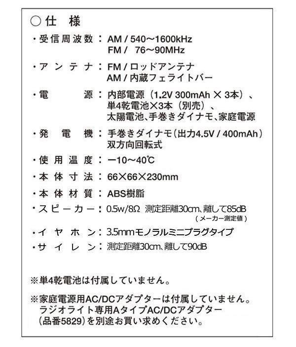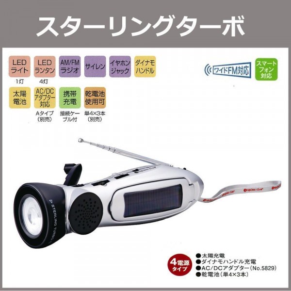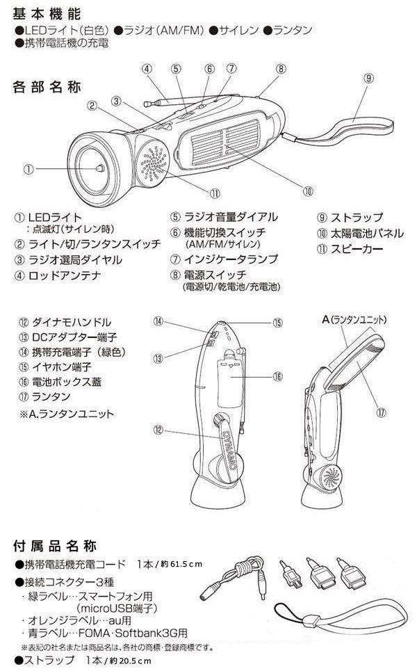 その優雅なフォルムは機能と機動性の証。いざというときに必要な機能を搭載した、多機能ラジオライトです。付属の接続ケーブルで携帯電話の充電が可能!! 製造国:中国 素材・材質:ABS樹脂 商品サイズ:本体:66×66×230mm 重量:本体:340g 仕様:日本国内意匠登録 第1265619号 付属品:携帯電話機充電コード1本、接続コネクター4種、ストラップ1本、取扱説明書、保証書(保証期間:1年間) ※サプライヤー直送品 ご注文後2~3営業日後の出荷となります【商品名】多機能ラジオライト スターリングターボ 6000