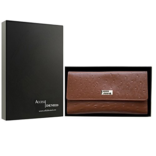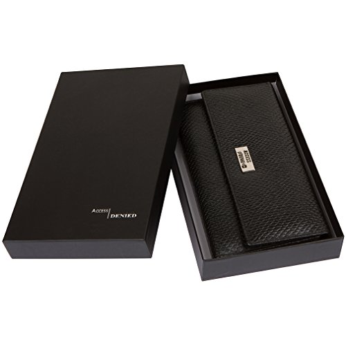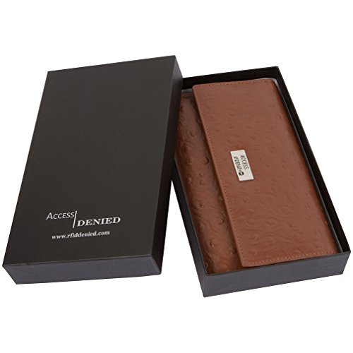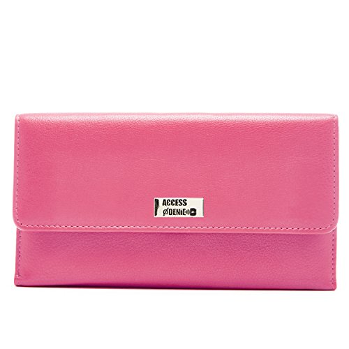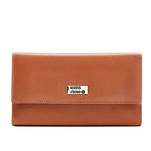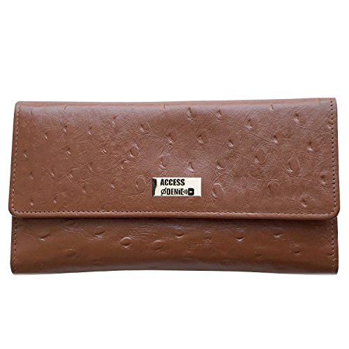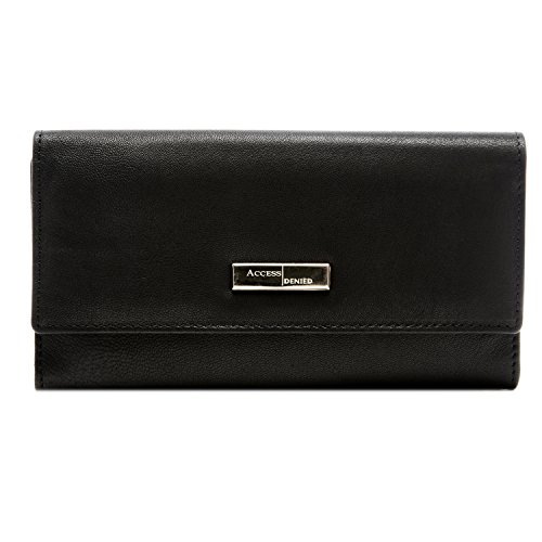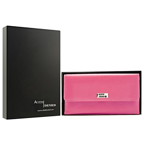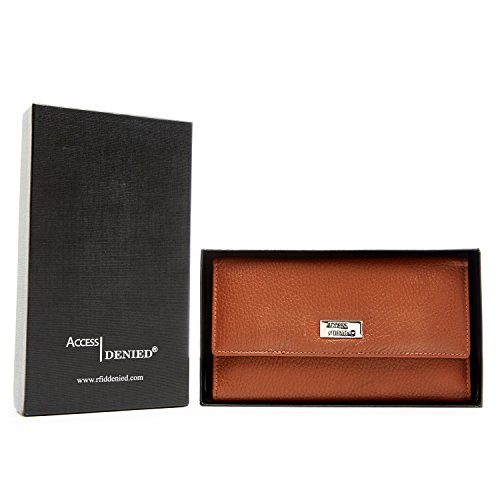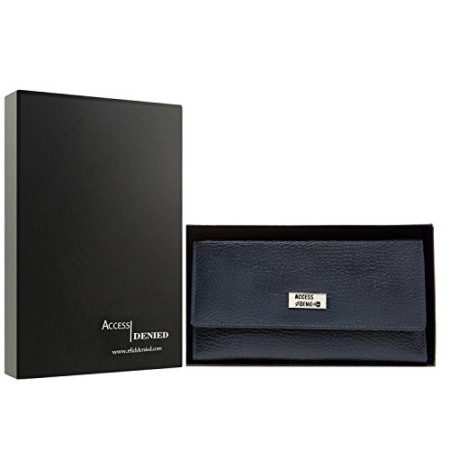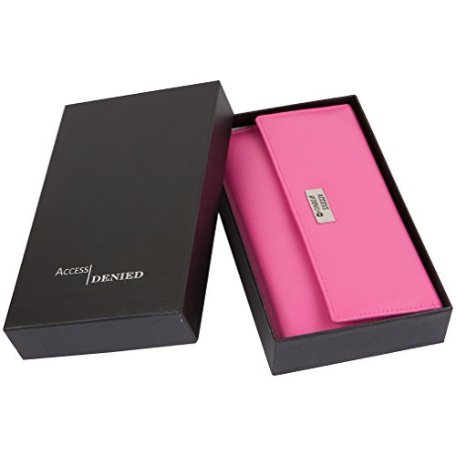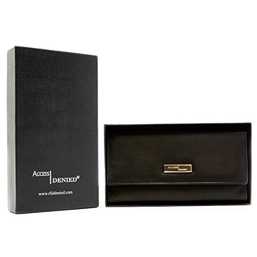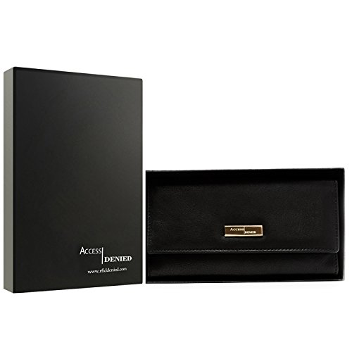 Binding : Apparel Product Description Each Access Denied women's wallet is RFID shielded in and around all pockets and folds. Prevent thieves from remotely accessing (skimming) and reading your credit card account numbers and related private information. Don't become a victim of the silent crime of Electronic Pick Pocketing. Protect and lock your RFID chip enhanced drivers license, gift cards, credit cards, security cards and information safely and securely within our RFID blocking technology. Prevent and protect your identity from electronic pick pocketing. Access Denied Women's RFID Blocking Wallet Trifold Leather Clutch Organizer features 11 credit card slots, ID window pocket, currency pocket, outside zip pocket,checkbook pocket, interior zippered pocket and magnetic snap closure completes this multipurpose organizer clutch wallet. Every pocket and fold of this walled is lined with our proprietary RFID blocking technology so any pocket will safely and securely protect all your cards from electronic pick pocketing. Everyone should own a RFID protection wallet. Wallet arrives packaged in elegant gift box perfect for any occasion. Many color options to choose from, Silver-tone hardware. Length: 7.25 inches Width: 4.25 inches Depth: 1 inch. Visit our Amazon Access Denied store to see our complete line of RFID Blocking protection wallets for men and women. Access Denied is a registered trademark. Founded in 2008, Access Denied is a Woman Veteran owned company. Located in California we are in the epicenter of technology and dedicated to designing quality products that provide a true solution for protecting your personal information from Identity Theft 0