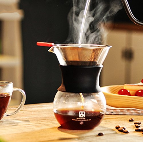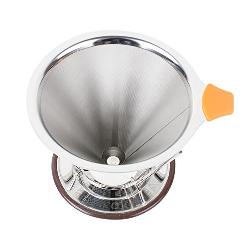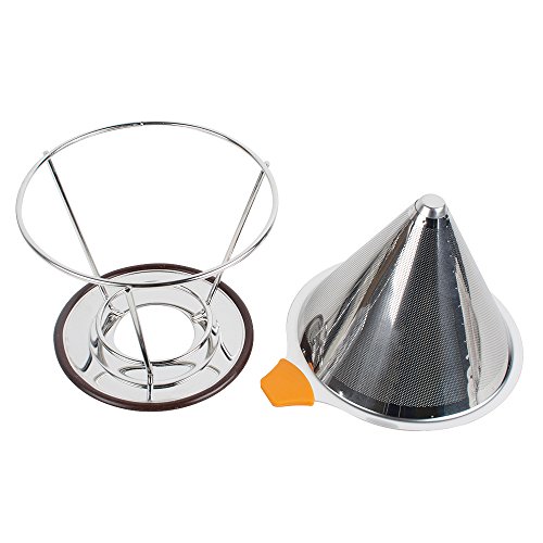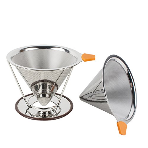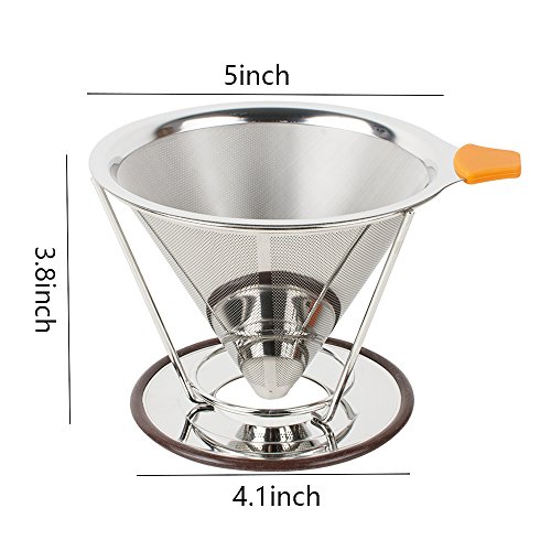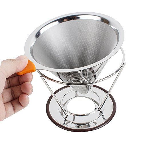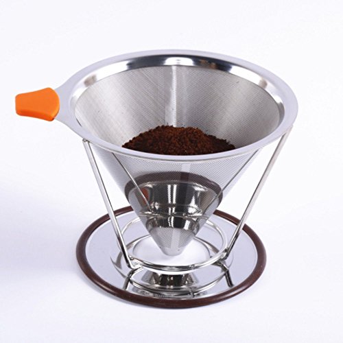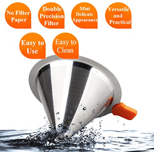 -. Feature : 【TOP QUALITY MATERIALS】Our fine mesh dual stainless coffee filter is made of the highest quality stainless steel without using paper filters; its reinforced steel mesh is extra durable, allowing brewing at the perfect rate; the bottom base will stay on and not break; with the extra fine wire mesh at the lower part of the filter; no grounds end up in your cup / 【SIMPLE TO USE】Being compact and lightweight, the coffee drip cone works great at home or work or while traveling or camping; simply heat the pour over coffee filter with hot water and rinse out, add coffee grounds, slowly pour in the hot water, let the coffee maker drip out the water through the fine pour over filter, and remove the coffee dripper when done, ready to enjoy your drink / 【LIGHT AND PORTABLE】No need for a coffee machine to have a decent cup of coffee on your home travels or office, you can take it where you want, to the office, on a camping, caravan or hotel trip. The built in stand is designed to fit on most cups, mugs, thermoses, small pots and even carafe. A perfect gift for the coffee lover in your life / 【SCALD-PROOF HANDLE DESIGNED】With a removable rubber grip and ring to help pour the hot water safely,easy to grip and can be removed easily for washing / 【EASY TO CLEAN AND NO USE OF PAPER COFFEE FILTERS】Once done using the coffee brewer, rinse it quickly by hand and immediately use it again for another flavor; since it is a reusable coffee strainer made from stainless steel, it is better quality than plastic, ceramic, or glass coffee filters, it saves you money not buying paper coffee filters