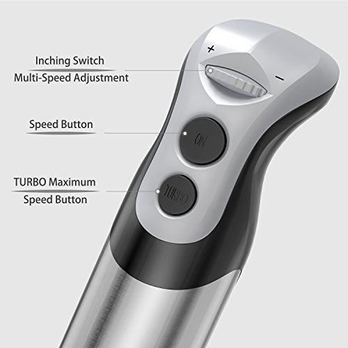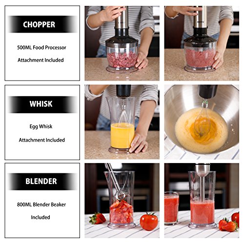 Feature: -Stick design reaches into pots, pitchers bowls to extend your blending options even further. -Ergonomic design for a comfort hold more control. -Easy clean-up and anti-slipping. 500ml Food Chopping Bowl The super sharp blades can chop foods whether wet, dry, including meat,leaves,cheese,onion,herbs,garlic,carrots,walnuts,almonds,prunes etc. A quick pulse will leave foods chunky, or blend until smooth to make sauces, salsas, pesto, houmous and more. extremely hard food such as ice cubes, nutmeg, coffee beans and grains will not be chopped. The 350W motor allows effortless blending! Powerful yet quiet.