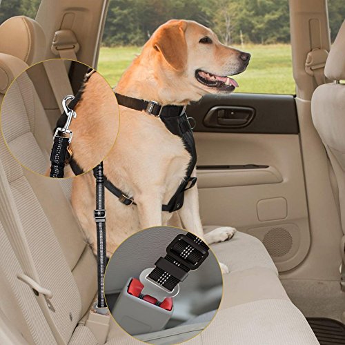 Simply clip the pet seat belt in your pet harness, and snap the belt tab right into the seat belt receptacle of your vehicle, securing your pet into place.