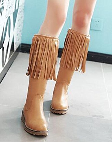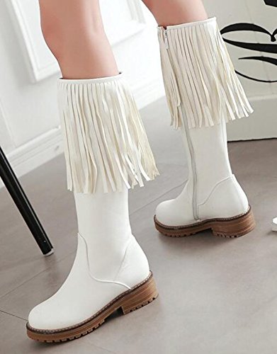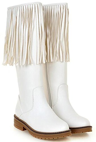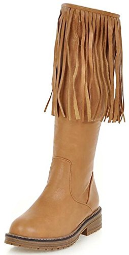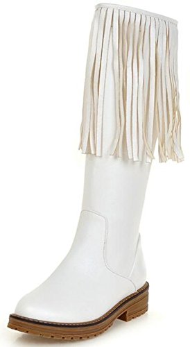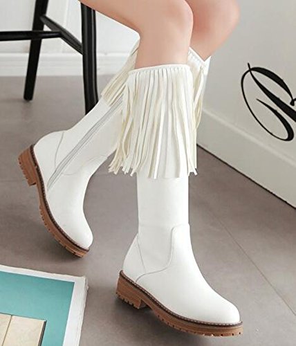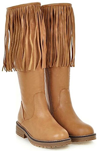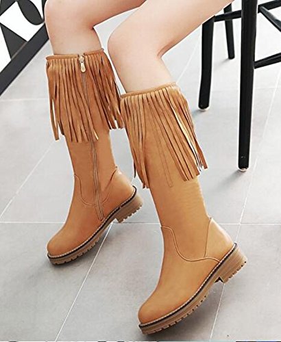 (IDIFU)/Women's/Boots/DIRECT FROM USA/IDIFU Women's Unique Fringes Round Toe Mid Chunky Heels Full Zip Up Mid Calf Boots Long Booties