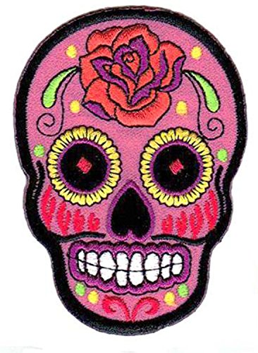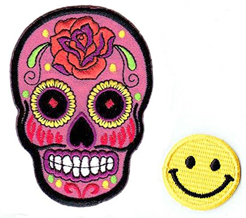 -. Title : "PINK ROSE MEXICAN SUGAR SKULL" Applique embroidered iron on PATCHES for cap, jacket, T-Shirt, jeans, backpack with Yellow Tiny Smiley Patches by PATCH CUBE