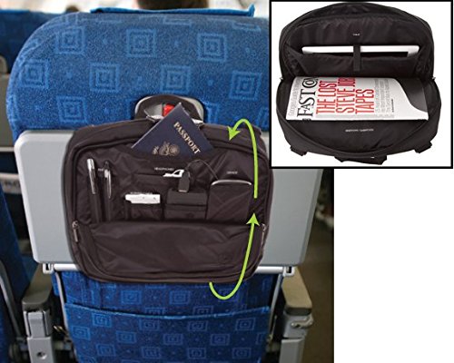Product Description This innovative bag with its patented design wraps around the airplane seat in front of you so you have quick access to all your flight needs. Recharge your smartphone directly from the pack by integrating the Portable Mobile Charger. Designated compartments for your iPad, magazines, headphones more. 0