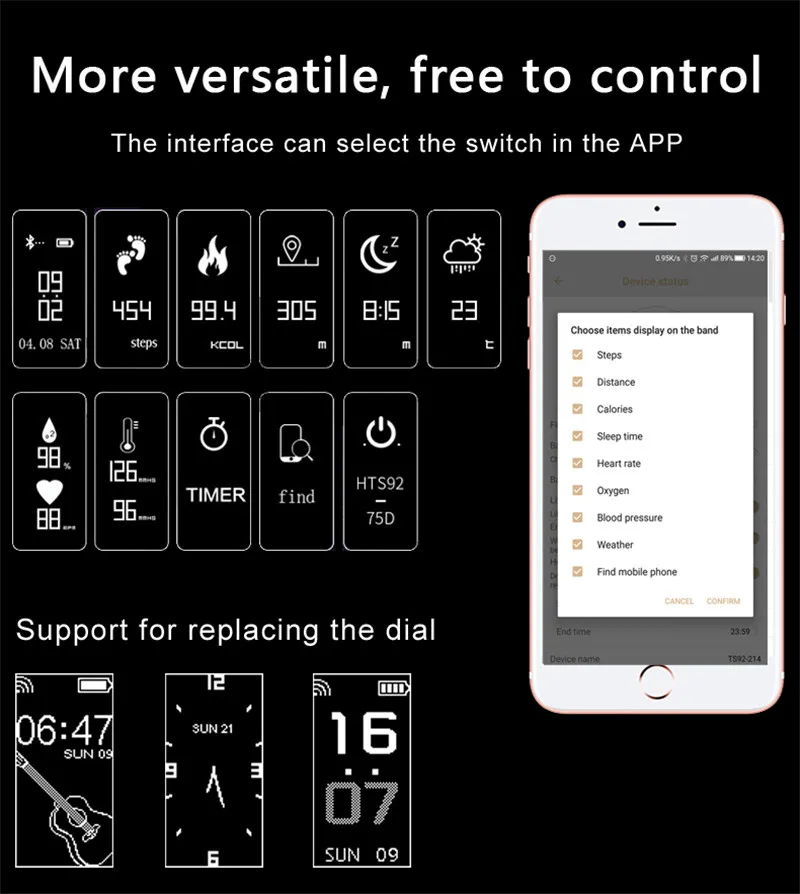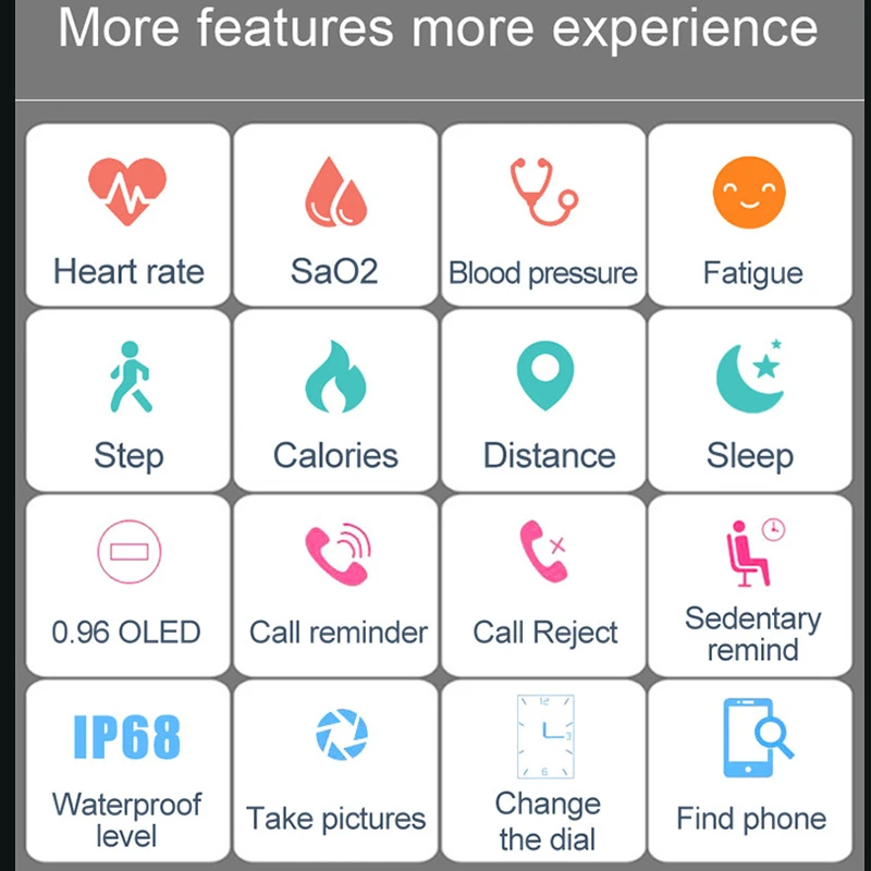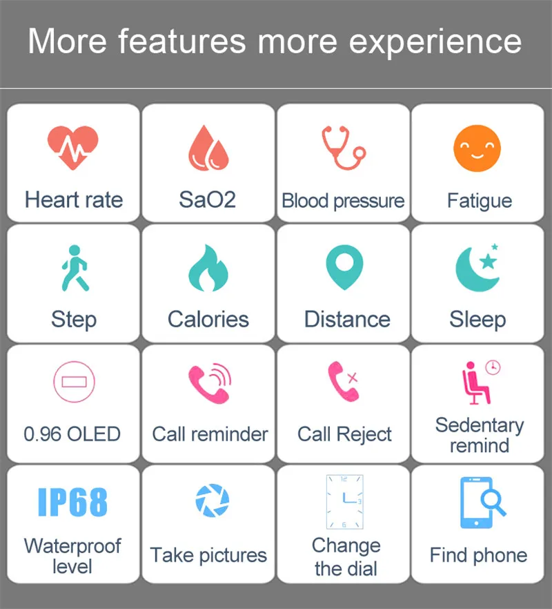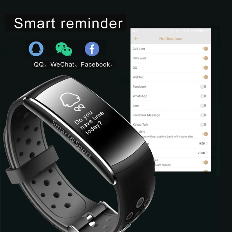 Function:Passometer,Social Media Notifications,Sleep Tracker,Alarm Clock,Push Message,Activity Tracker,Message Reminder,Heart Rate Tracker,Call Reminder,Fitness Tracker,Speed Measurement,Blood Pressure,Blood Oxygen