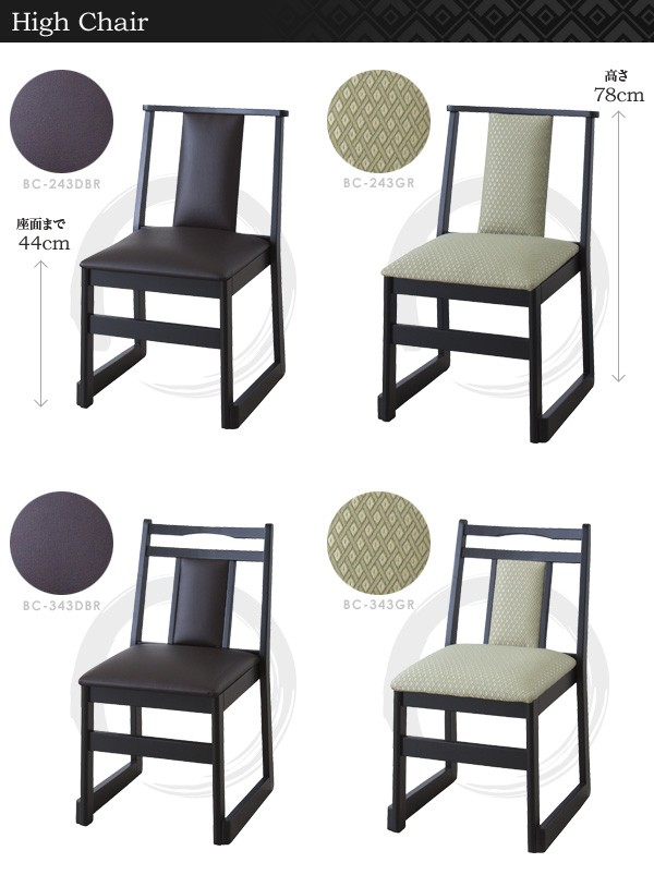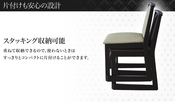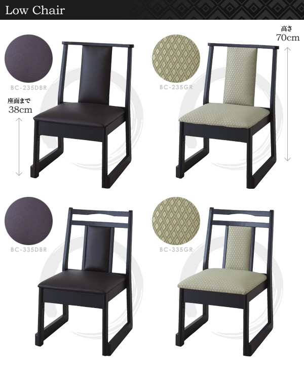 格調高いおもむきのお座敷チェア。料理店や法事など幅広くご利用頂けます。テーブルの高さに合わせ、二種類の高さ・デザインよりお選びください。