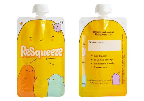 - Feature : ANNIVERSARY SALE! ReSqueeze is TWO - Our Biggest Sale Ever! Includes 4 reusable ReSqueeze pouches with 6 oz. capacity, clear fill line and measurement markings on back (9 oz. pouch now also available!) / Top-spout. Extra wide bottom opening for easy filling and cleaning (no filling gadgets required!) / Heavy duty dual-zip closure for no leaks / Hand-wash recommended for best clean, dishwasher friendly (top rack) for sanitation, freezable / Constructed of layers of nylon (for strength and durability) and food-grade plastic (BPA & PVC free)