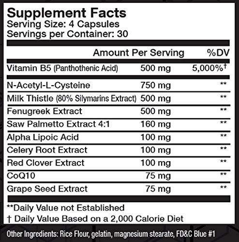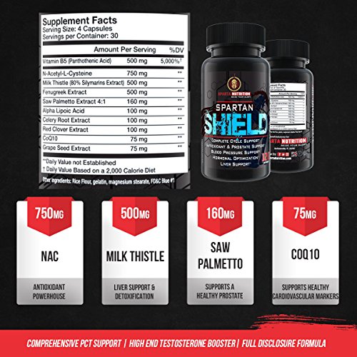 -. Feature : LIVER SUPPORT - Clinical dosages of NAC (N-Acetyl Cysteine), Pantothenic Acid (Vitamin B5), Alpha Lipoic Acid, and Milk Thistle provide ample liver support to help your body detox and flush out unwanted toxins. Spartan Shield is potent liver and organ defender supplement that features 5 potent antioxidants meant to aid overall organ support and health. / CARDIOVASCULAR SUPPORT - By including CoQ10 & Grape Seed Extract, Spartan Shield also provides cardiovascular health support. Optimizing cholesterol levels already within normal levels is a key to maintaining excellent heart health. This cycle support supplement will aid overall heart health and help maintain healthy levels of key cardiovascular markers. / PROSTATE SUPPORT - By including a high dose of Saw Palmetto Extract, Spartan Shield helps support overall prostate health. Prostate health is crucial where you are on cycle, post cycle, or are just looking to maintain optimal everyday health. / BLOOD PRESSURE SUPPORT - Spartan Shield includes high quality ingredients that also help aid blood pressure levels already within normal ranges. Healthy blood pressure levels is crucial for those on cycle, as elevated blood pressure poses many health risks. By supporting healthy and normal blood pressure levels, Spartan shield can aid your overall health. / PLENTY OF ANTIOXIDANTS - NAC, Alpha Lipoic Acid, and Grape Seed Extract provide your body with the antioxidant support to enhance levels of Glutathione in the body. Glutathione is a non-essential amino acid that acts as a powerful antioxidant and defends against free radicals and oxidative stress. By utilizing these high-quality anti-oxidants, Spartan Shield also helps cleanse your body of toxins and detoxes them to keep your body running great.