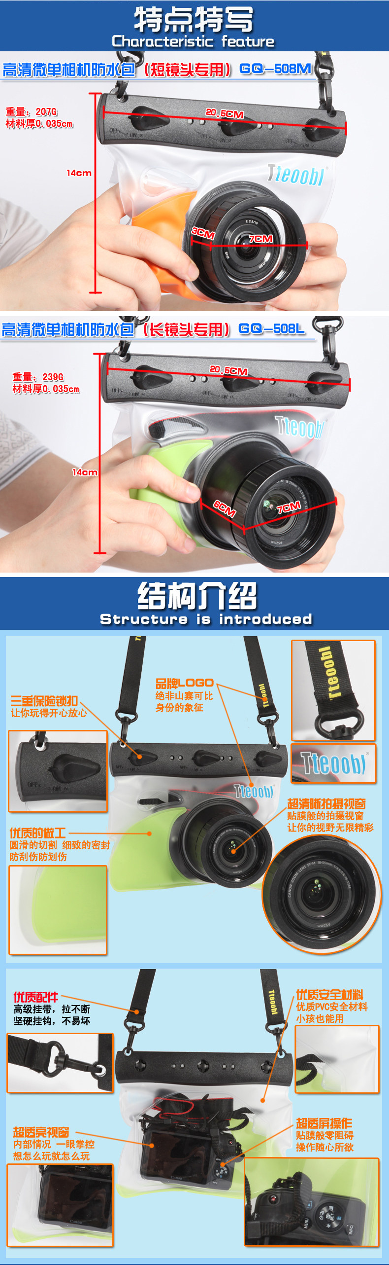 HD waterproof micro-single long lens photography equipment safety, is dedicated micro-single long shot for 5-7 cm long single micro lens. Please choose another short shot short model GQ-508M, suitable water park, swimming, diving, rafting, outdoor and other sports.