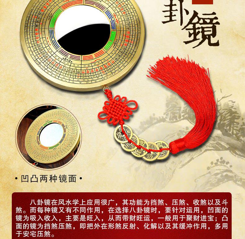 The Feng Shui Bagua Mirror is a round mirror surrounded by an octagonal frame with the Feng Shui Bagua design. It is a traditional Feng Shui cure commonly used for protection against the most malignant type of energies – the killing energy or Shar Chi generated from ‘poison arrows’ directed to your house, shop or building. At its best, this kind of killing Chi could result in arguments, depression and minor misfortunes, and at its worst brings severe sickness, mishaps, accidents and even death in the household if it is not promptly dealt with. Baguas are also used to also repel evil spirits and people with bad intentions towards you. Bagua mirrors can be designed as concave or convex mirrors for different ways of manipulating the outside energies of negative quality. A Concave Bagua is used to absorb Shar Chi and preventing it from entering the house whilst a Convex Bagua deflect and reflect all harmful chi away. As this may harm your neighbors and immediate surroundings, great care must be taken before installing a Convex Bagua.Please note that the Bagua mirrors should never be used inside a home.