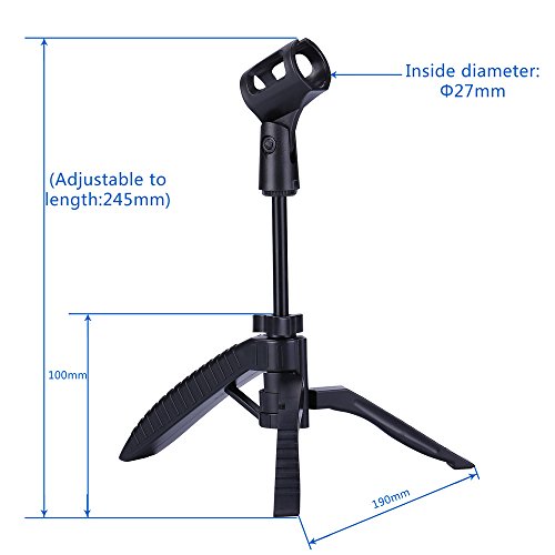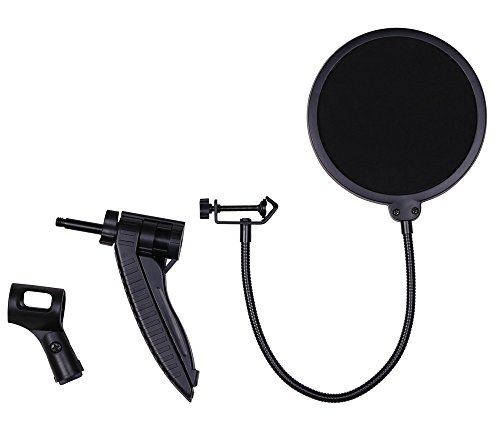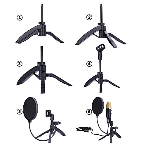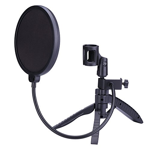 -. Feature : Package include: Desktop Tripod Stand + Mic Clip + Pop Filter. Ideal for recording podcasts or other desktop applications / The tripod stand is adjustable, you can adjust suitable angles as you need. The height of the tripod also can adjust from 3.7" to 9.6" inches / Double screen pop filter: The gap between the two screen can block unwanted popping in recording, busting the pops of "S","P"s and "B"s.Effectively reduce the plosive, wind interference, saliva spraying / The pop filter has a metal gooseneck that can support its own weight. And the gooseneck is super-flexible and long enough to set the angles you like / The mic clip for microphone type: Diameter of mm microphone. If you want to clip large diameter, you can change a large shock mount.
