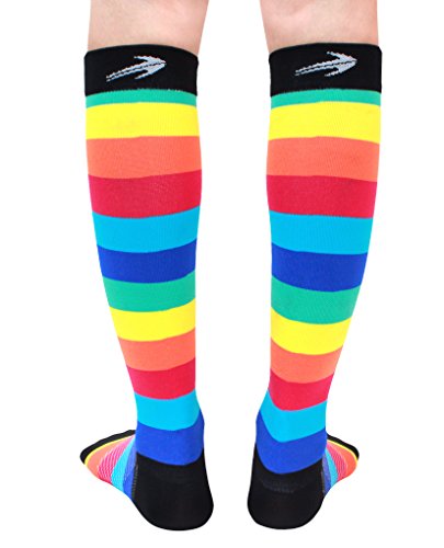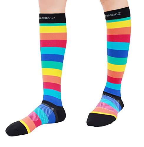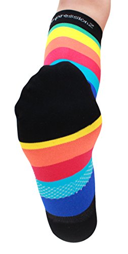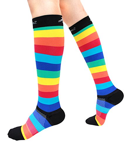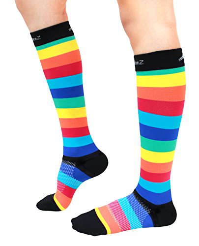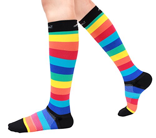 - Feature : GRADUATED COMPRESSION 20-30mmhg - better blood circulation as strongest compression happens at the ankle, and gradually decreases moving up the leg / FUN, COLORFUL & MAKES YOU UNIQUE -why settle for the same old boring colors? Celebrate your uniqueness with something fun! Celebrate You! / PROMOTES FASTER MUSCLE RECOVERY - better oxygen circulation helps reduce lactic acid build up / ANTI ODOR & ANTI STATIC - deodorizes & keeps you dry & comfortable even with longer use / IDEAL FOR SPORTS & DAILY WEAR - reduces muscle fatigue for all kinds of sports, especially if on your feet for long periods of time, or traveling