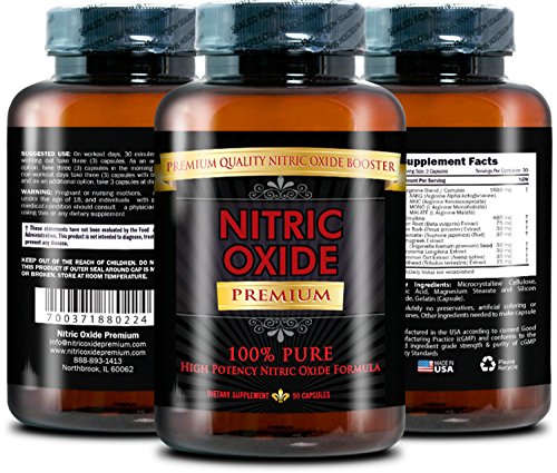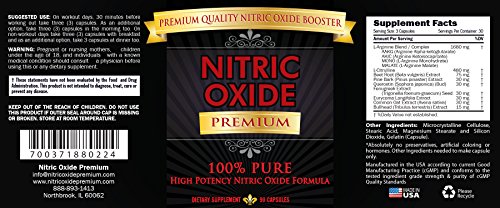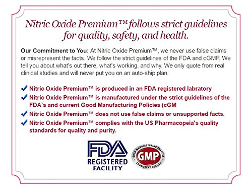 NITRIC OXIDE PREMIUM is manufactured in an FDA registered lab that is cGMP certified and complies with the US Pharmacopeia's standards for quality & purity. NITRIC OXIDE Premium contains no additives, preservatives or unrelated ingredients. Each bottle includes 90 capsules. It is made in the USA.