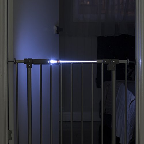 - PRODUCT DETAILS: The Stellar LED Baby Gate measures 28.8” - 32.3” wide by 30” tall with dual sensor LED light, rubber bumpers, non trip Safe Step bottom bar, magnetic auto lock with stay open feature and 2 way opening directional control